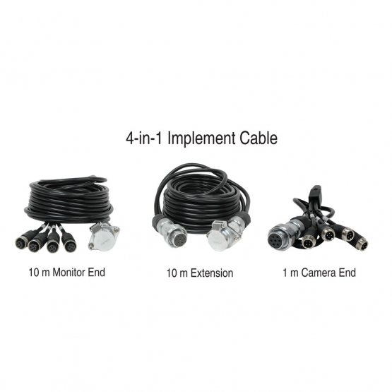 The 4-In-1 Implement Cable is designed to connect multiple cameras (up to 4) on your air cart to your cab monitor with a single cable making hitch connections a breeze. It includes a short 4-way splitter cable to connect up to 4 cameras on the air cart, a 10M extension cable for across the seed tool, and a 10M tractor cable with 4-way splitter to connect to camera inputs on the monitor.