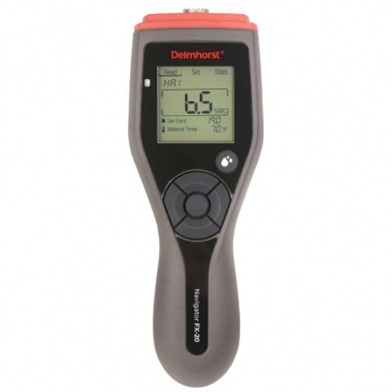 FX-20 Digital Moisture Meter for Hay is the latest in the new Navigator family of moisture meters from Delmhorst. Uniquely designed for use in the field with a dashboard-like display that is easy to read under most conditions, and large, easy to use navigation buttons. Hay meter is perfect for large and small volume producers to ensure reliable %MC readings in the windrow or in all size bale packages. Large custom display with auto backlight