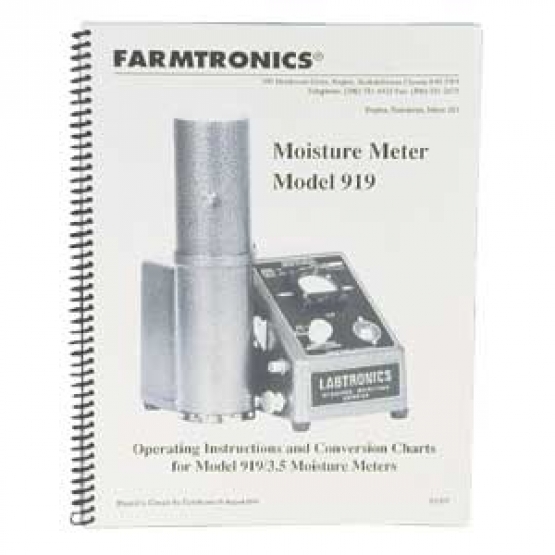 This 96 page book contains information on 919 accessories, operating instructions, test weight determination, calibration information, and Canadian Grain Commission conversion charts.