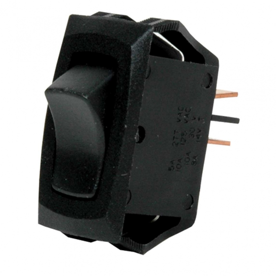 Black Rocker and Bezel. Snap-in miniature switches are single pole (On-Off) with an aesthetically pleasing curved rocker. Due to their size, they fit in standard size cut outs. Rate at 10 amps at 30V and 8 amps at 12V with 1/4" male tab contacts. Available with a black, unmarked rocker with a red visible indicator when switched on. Mounting hole is .480" x 1.072".